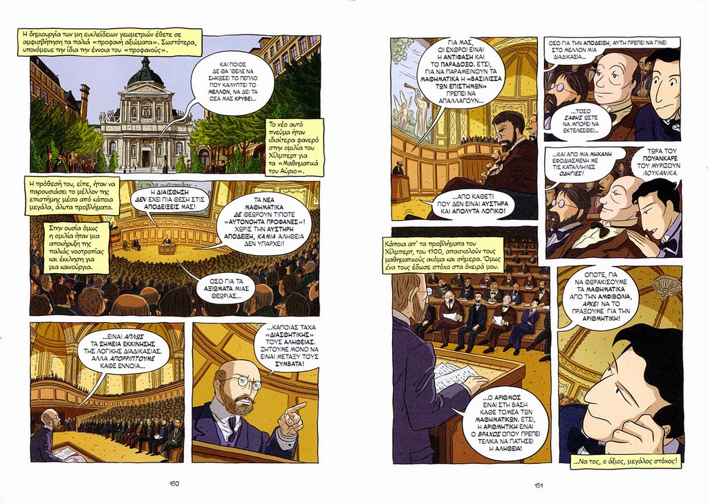 Además del pensador galés, por las páginas del libro desfilan algunos de los matemáticos y pensadores mas famosos del siglo XX: David Hilbert, George Cantor, Henri Poincaré, Ludwig Wittgenstein o Kurt Gödel, entre otros. Me produce un enorme regocijo encontrarme con algunos de ellos después de tantos años y sobre todo un medio como el cómic. Estos personajes no pasan por el tebeo de refilón: el libro en cuestión, con su cuaderno de notas incluido, tiene mas de 350 páginas.