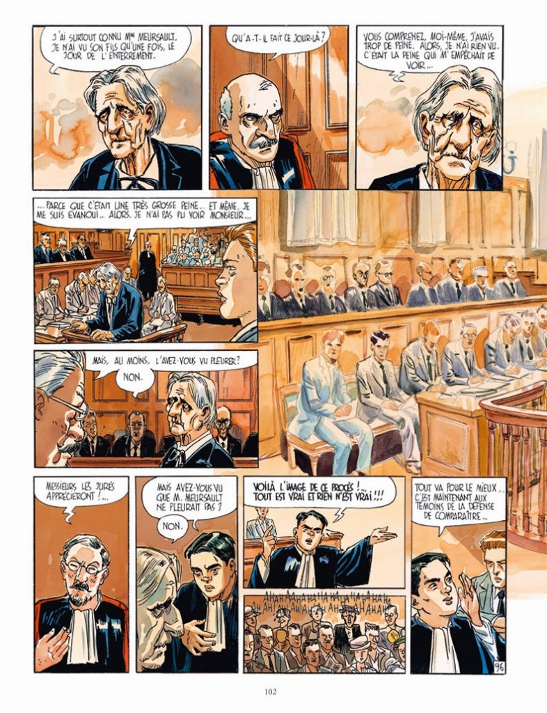 Ya que comenzamos hablando de cine, resaltaré que Ferrandez introduce una larga secuencia, en la que Meursault y Marie acuden a un pase de la película protagonizada por Fernandel, Le Schpountz (1938), de Marcel Pagnol, (a diferencia de la adaptación que realizó Visconti, en la que Mastroianni y Anna Karina visionan La ley es la ley, de 1958).