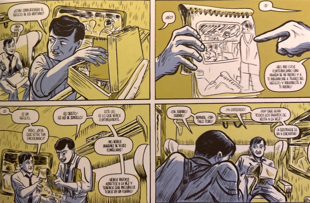 Por el contrario, su aspecto gráfico es bastante correcto y de hecho, resulta bastante adecuado. El tratamiento del color, del que se ha dicho de todo, muchas veces negativamente, también me parece acertado. Esto me conduce hasta la otra obra que he leído en la que también dibuja Nick Bertozzi, Houdini, el rey de las esposas (Astiberri, 2007), obra que también, sorprendentemente, es más aburrida que ésta: gráficamente no están tan lejos una de otra, aunque yo creo que el dibujo de esta última, por algún extraño defecto de maridaje con el guionista Jason Lutes, no acaba de cuadrar.