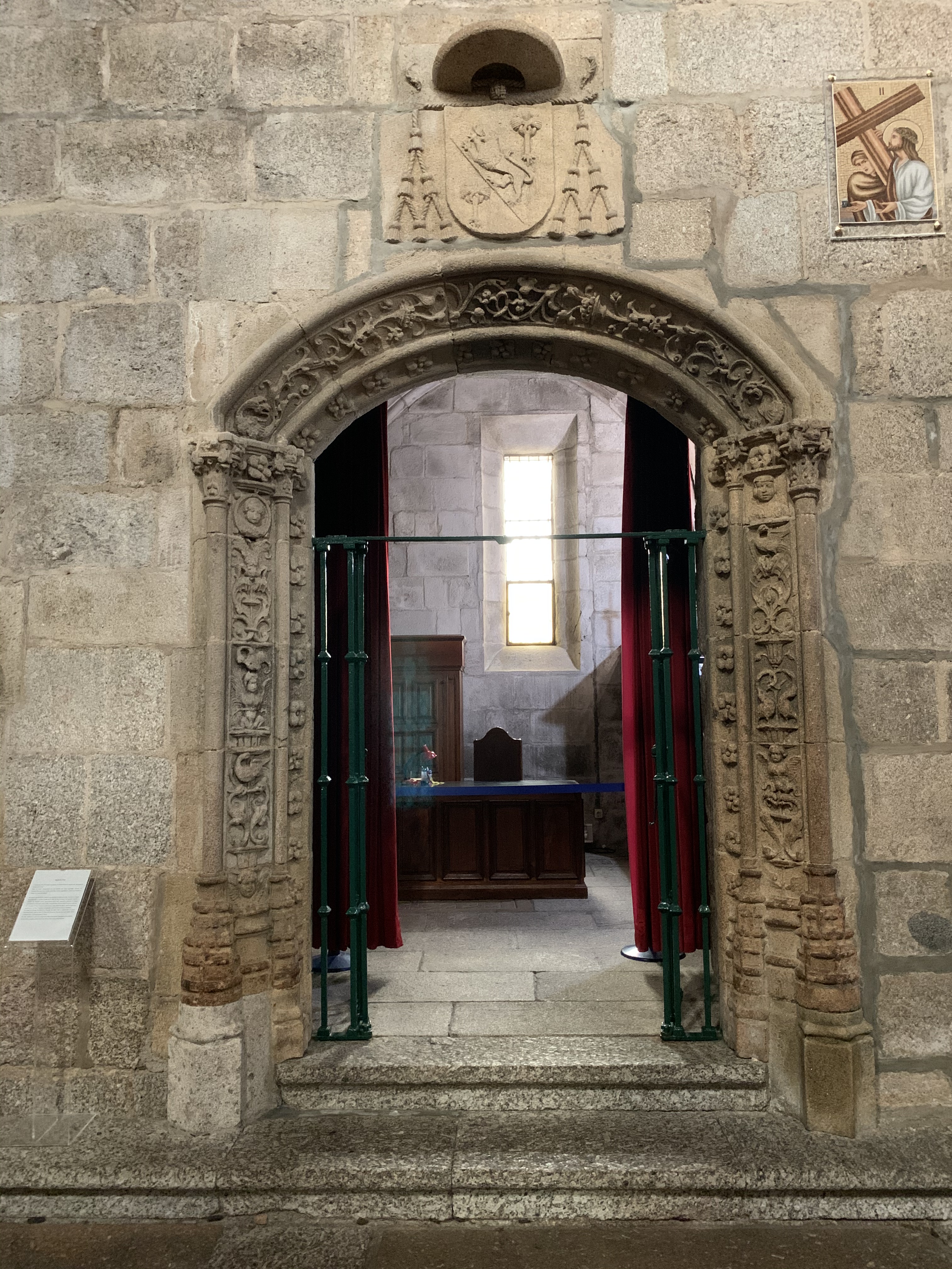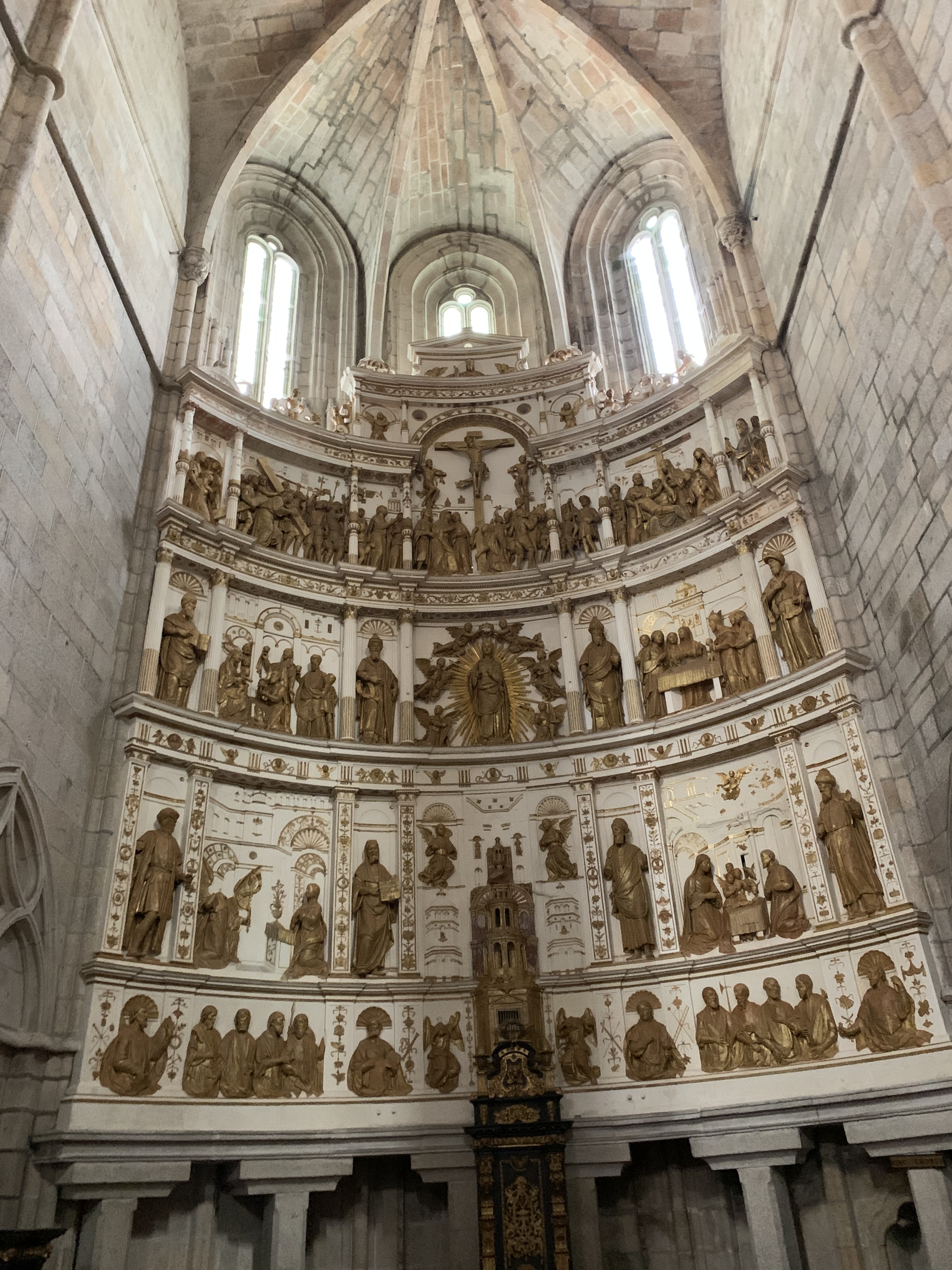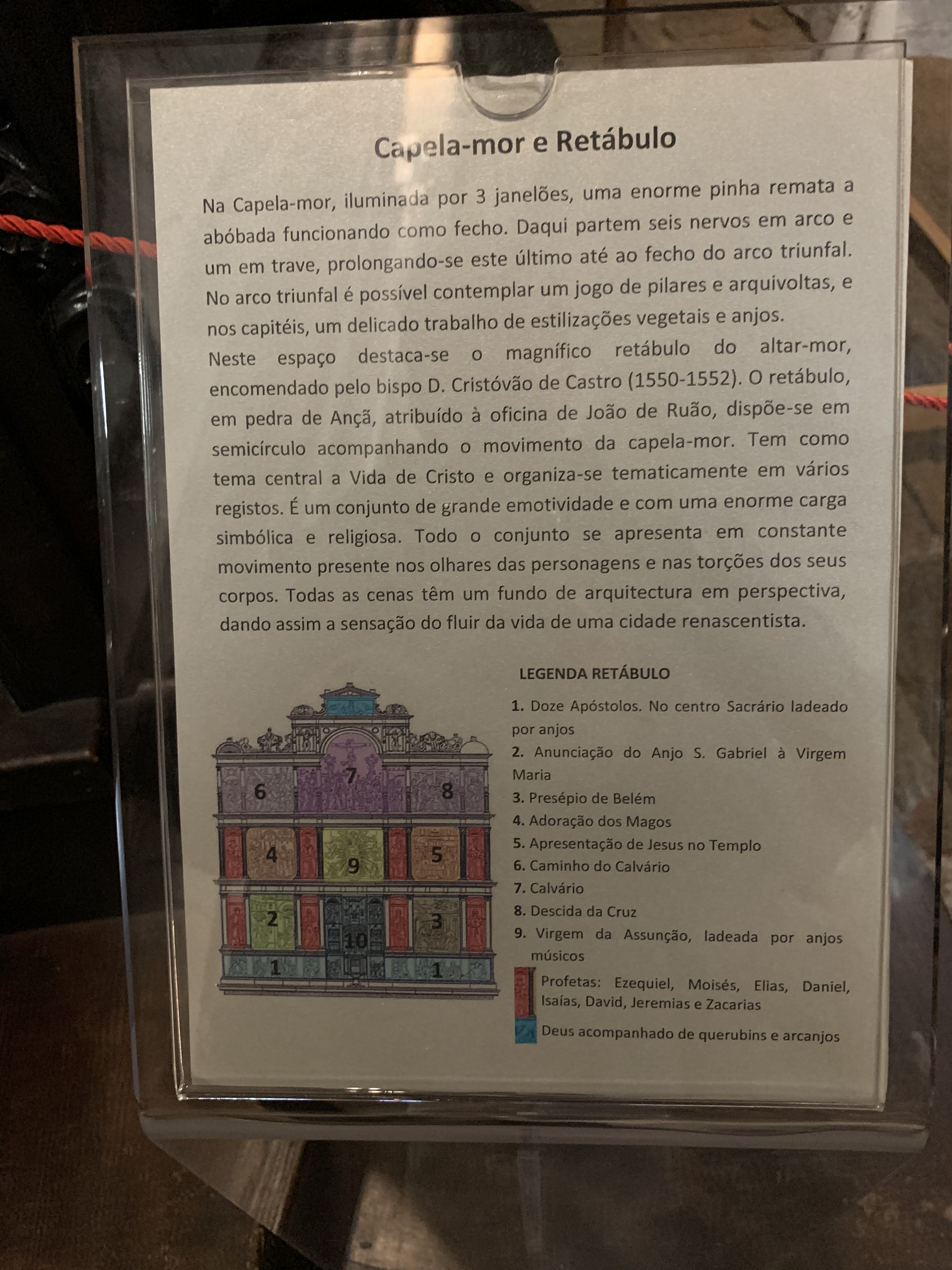 El edificio de granito destaca por su aspecto fortificado, erigiéndose hacia el cielo con pináculos y contrafuertes, que se intercalan con los elegantes elementos decorativos manuelinos. En el interior se puede admirar el retablo mayor, renacentista del siglo XVI, elaborado en piedra de Ançã, ejecutado por el taller de João de Ruão (Juan de Rouen) en Coimbra, dorado en el siglo XVIII y que está considerada como una de las mayores obras de escultura del periodo más tardío del Renacimiento.